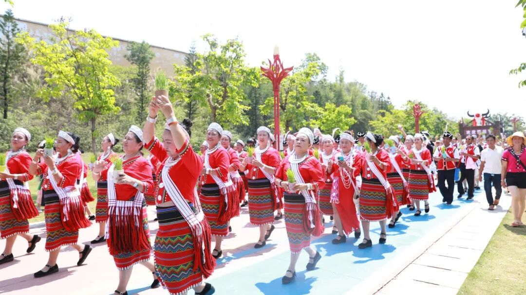 震天的木鼓声响起,悦耳的歌声唱起,甩起长发,欢歌劲舞。身着漂亮民族服饰的各族群众,一路歌,一路舞,一路欢声笑语,千人齐心拉着木鼓。佤族长者高举象征着财富、吉祥安康的牛头走在方阵的最前面,佤族群众手捧稻谷、玉米青苗,以舞蹈的方式展示佤族同胞们辛勤劳作、共庆丰收的新气象。
