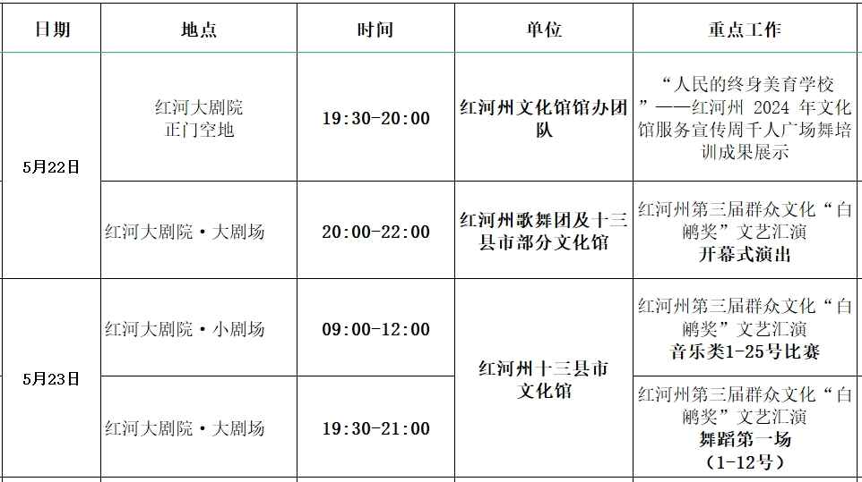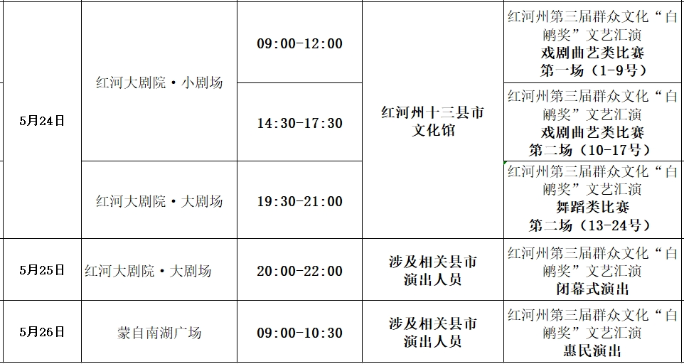 本次汇演将于5月22日晚正式开幕,5月23日、24日进行节目汇演,5月25日闭幕,5月26日上午将在蒙自南湖广场举办惠民演出。本次节目涵盖音乐、舞蹈、戏剧(含小品)、曲艺(含相声)四个类别。开幕式将上演在省级以上获奖的各舞台艺术门类优秀作品,两天的汇演对州县两级文化馆及社会群体中遴选出的优秀节目进行展示,同时将邀请省级的专家评委对四个类别的节目进行现场评分,按得分从高到低的顺序,取排名靠前的作品颁发“白鹇奖”(每个门类各6名),并颁发“优秀组织奖”5名。闭幕式及惠民演出则将对本次汇演中的优秀节目进行集中展示。