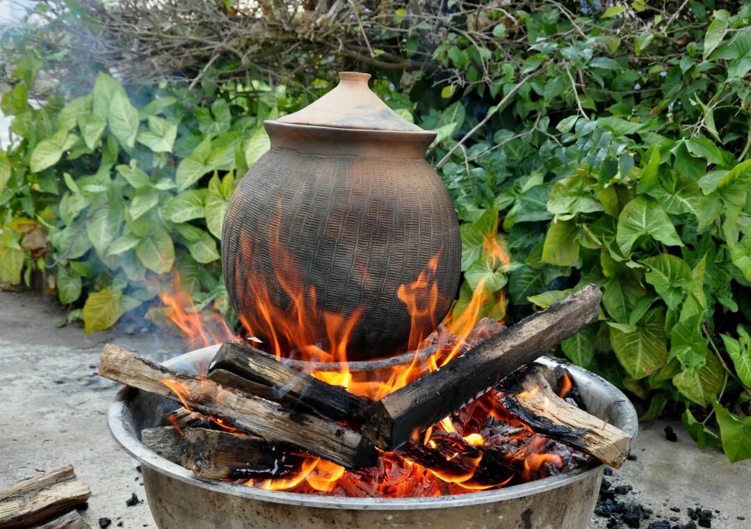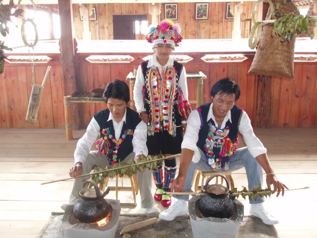 哈尼族的“土锅茶”是一种古老的饮茶方法,其制作时,先用大土锅将山泉水烧开后,放进烧香的茶叶,煮5—6分钟后,将茶水装入用竹子制作的茶盅内。这种茶水清香可口,回味无穷。
