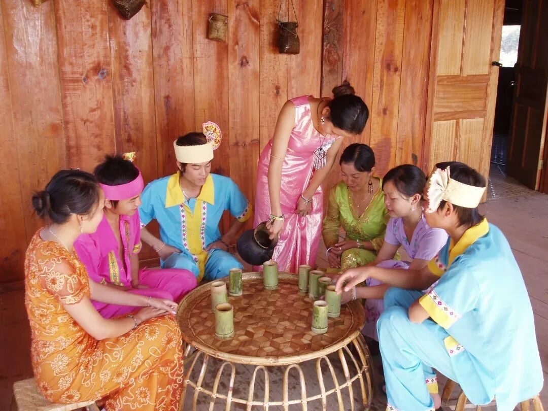傣族喜欢饮用“竹筒茶”,“竹筒茶”在傣语里称为“腊跺”,是一种充满诗情画意的饮茶方式。将晒干的春茶放入刚砍回的香竹筒,放在火塘的三脚架上烘烤6—7分钟后竹筒内茶叶软化,用木樟将竹筒内茶叶舂压后再装进茶叶,随后边装、边烤、边舂,直至竹筒内茶叶填满舂紧为止。待茶烤干后,削开竹筒取出圆柱型的茶叶,掰少许茶叶放人碗中,冲入沸水,约5分钟后即可饮用。这种竹筒茶,既有竹子的清香,又有茶叶的芳香,非常可口。