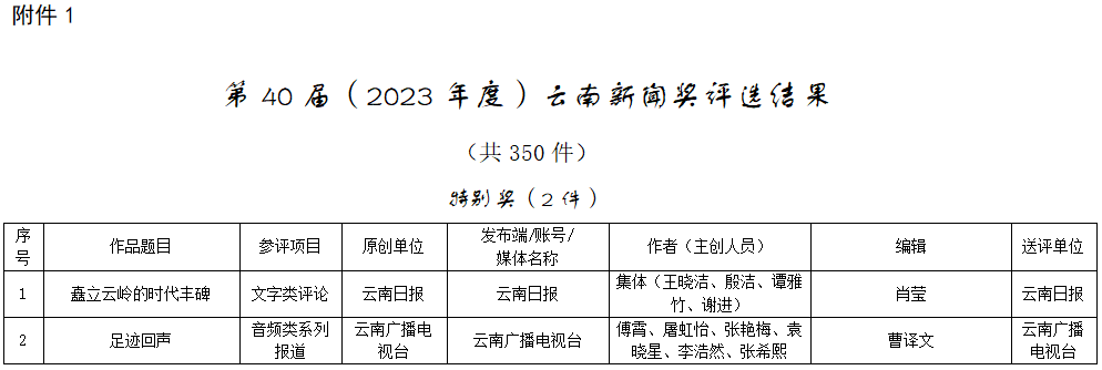 由云南省新闻工作者协会组织的第40届云南新闻奖和第4届云南省优秀新闻工作者评选活动,经过初评、复评及定评三级评审,评选出350件云南新闻奖优秀作品,其中特别奖2件,一等奖49件,二等奖103件,三等奖196件;评选出20位云南省优秀新闻工作者。