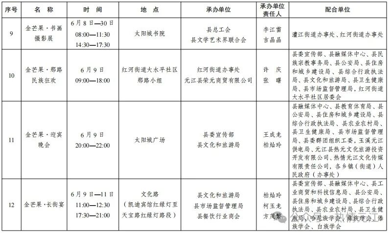 内容:举办民族风情长街宴,展示元江哈尼族、彝族、傣族、白族等少数民族特色菜品,推出特色套餐供游客选择品尝。
