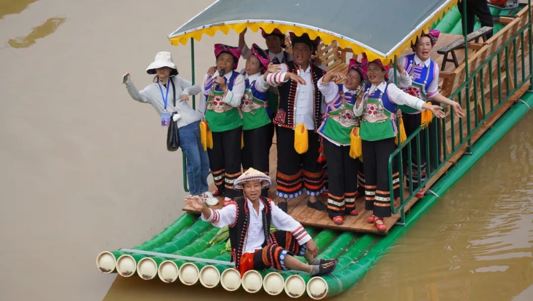 在5月20日的开幕仪式上,曲江镇王马寨村委会的村民身着民族服饰,在曲江大河上划着竹筏,纵情对唱山歌。随后,四条龙舟缓缓穿过历史悠久的大新桥。