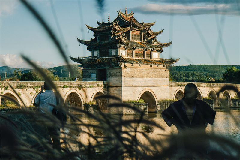 双龙桥位于建水县城西5公里处,横跨泸江河与塌冲河,因两河在此交汇,形如双龙而得名。双龙桥始建于乾隆年间,最初只有三孔,道光年间又建十四孔与之相连,所以又被称为“十七孔桥”。