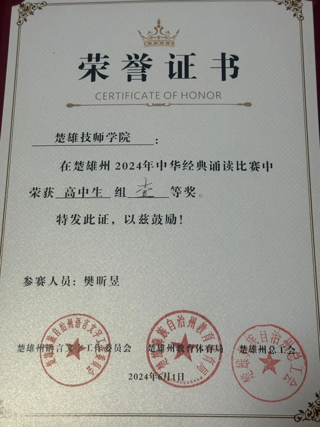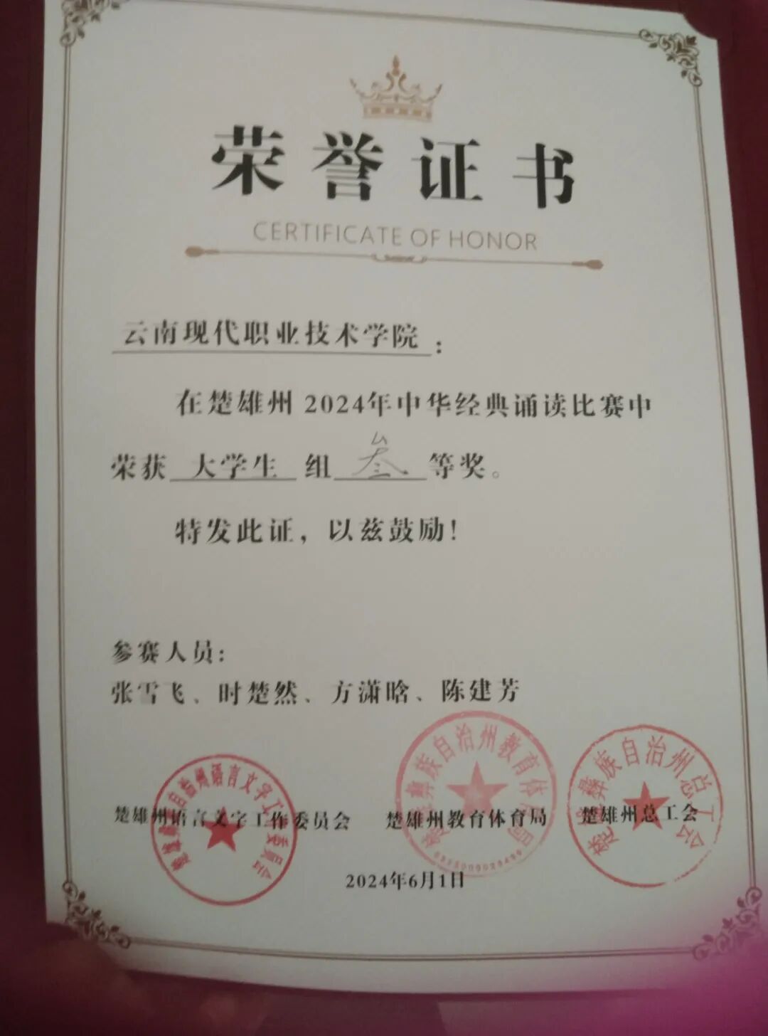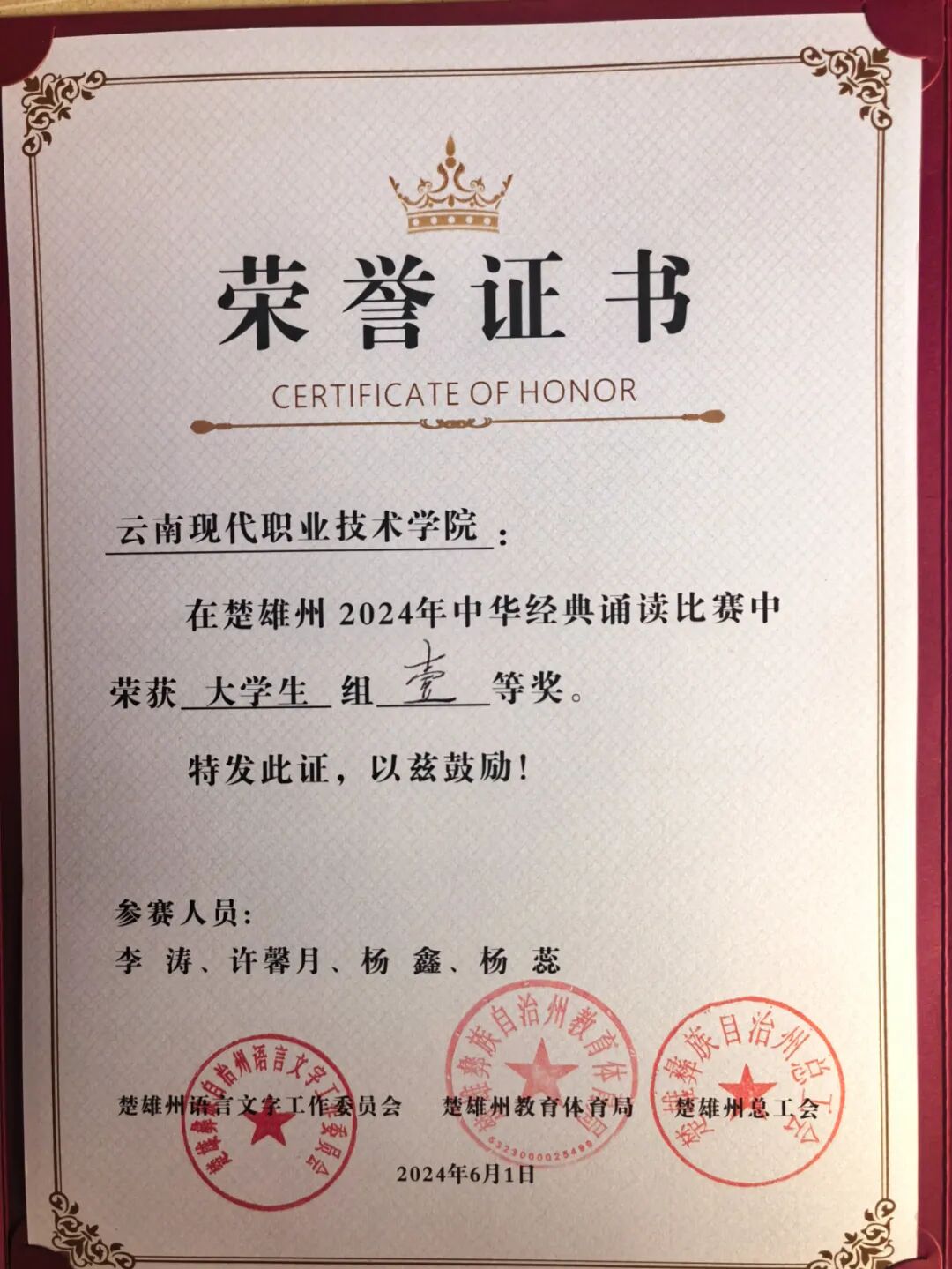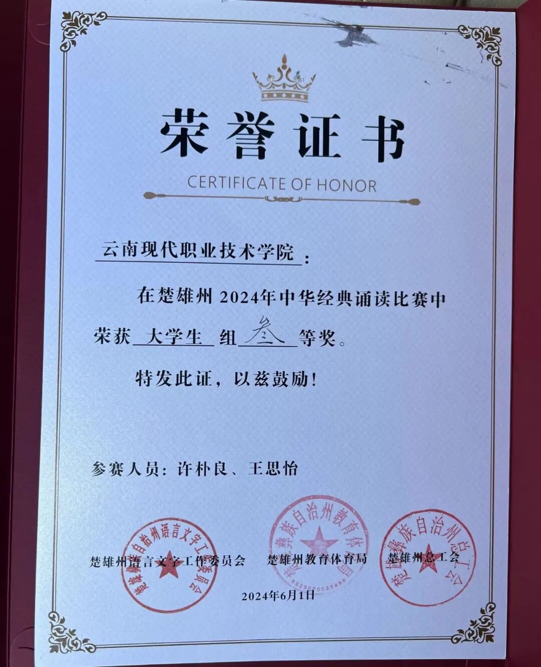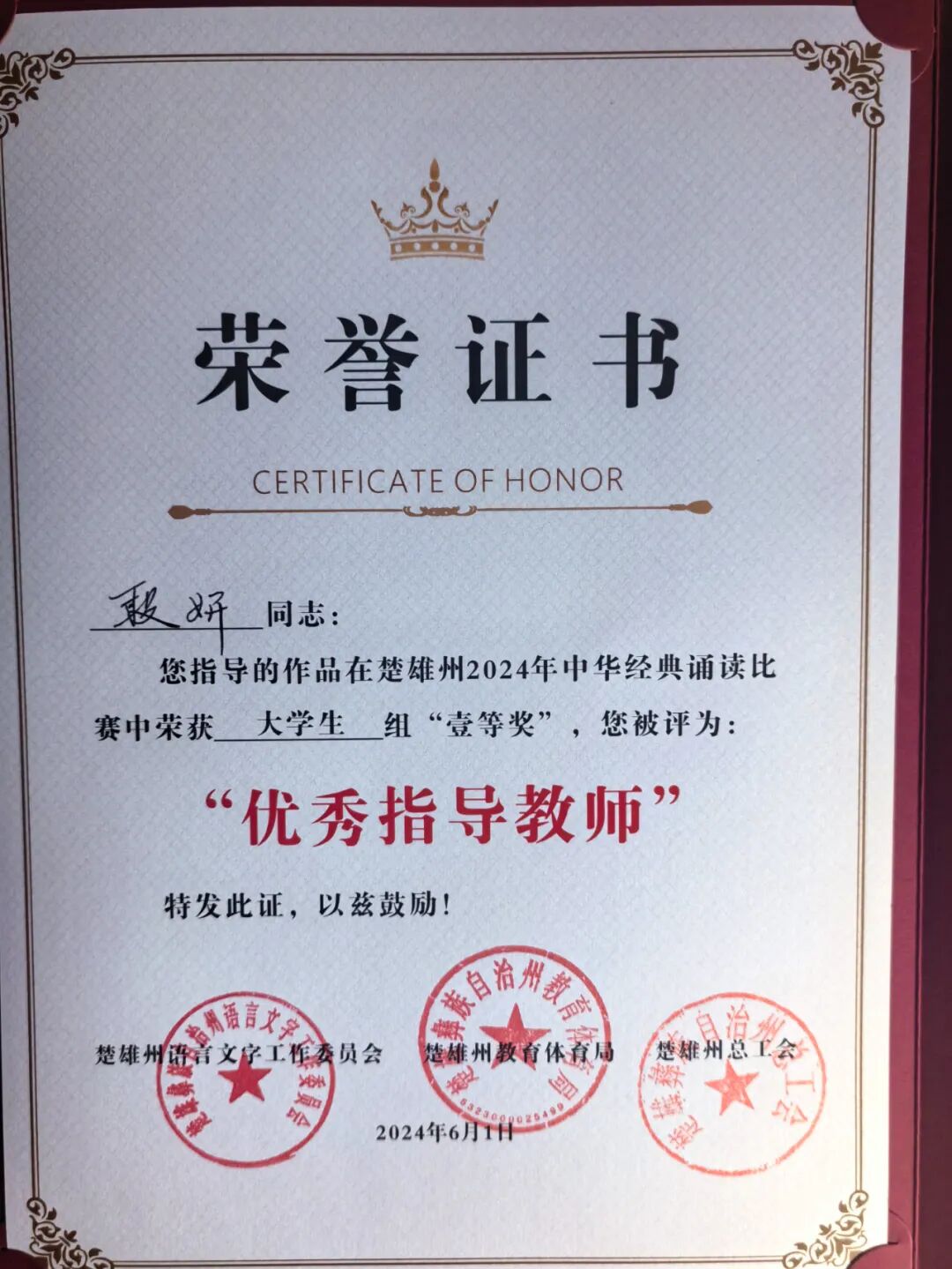 清音琅琅诵经典,书香悠悠沁心田。由楚雄技师学院、云南现代职业技术学院下属二级学院公共教育学院承办的首届中华经典诗文诵读校园大赛佳作频出。6月1日,在楚雄州教育体育局举办的“典耀中华 赓续文脉” 2024年中华经典诵读大赛中选送的作品斩获佳绩。其中,段妍老师指导的《记念刘和珍君节选》以9.722的高分获大学生组第一名,钱发俐和周中琼老师指导的《一件未织完的毛衣》以9.784的高分获高中组(中职)第一名,指导教师段妍、周中琼获得优秀指导教师奖,学校获得优秀组织奖,其余两件作品《琵琶行》《一百年华》获得三等奖。