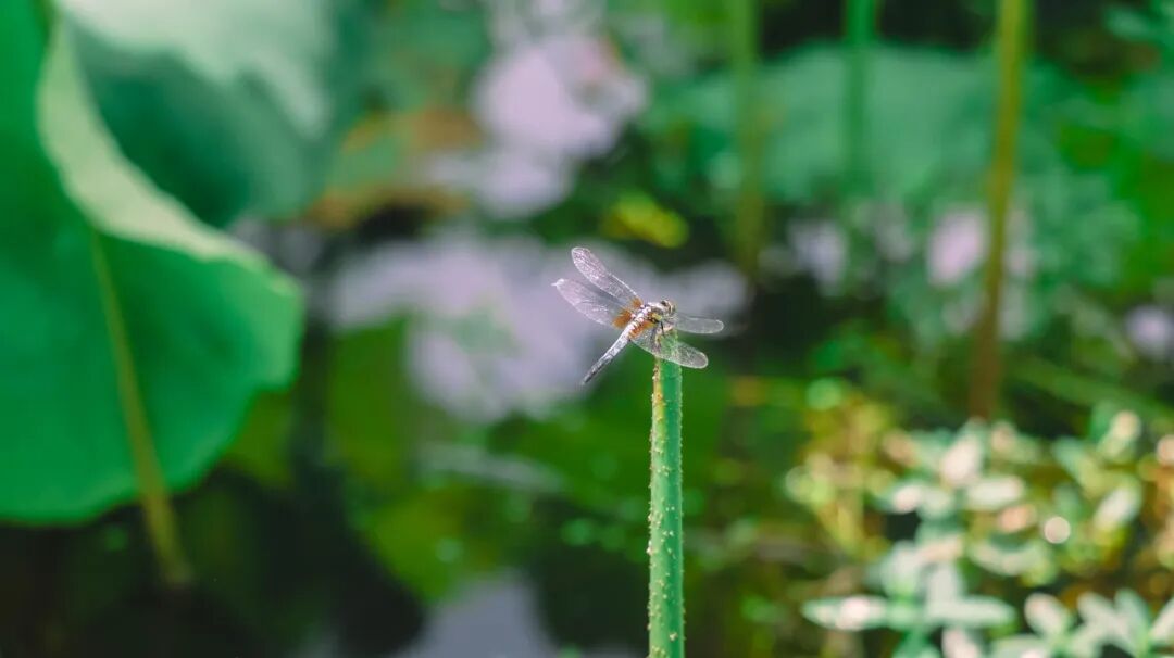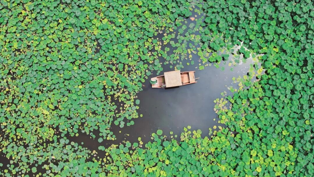 微风拂过,空气中传来阵阵清香,荷叶间互相碰撞,伴随着蝉鸣声、鸟鸣声,演奏着夏日的乐章。赏荷若是仅止步于荷塘边,显然不够尽兴,时而有游客,乘着一叶孤舟荡漾在荷塘中,或是静坐在舟头,酌一盏荷花泡的清茶;又或是往深处开去,近距离欣赏荷塘美色。