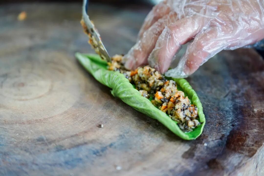 除了欣赏荷塘美景,团山景区还结合当地特色推出了荷花宴。为保证食材新鲜,用于荷花宴的所有荷叶、荷花、莲蓬都是当天采摘,紧接着就被送到乡愁餐厅备菜。每一道菜的制作过程十分复杂,比如将配置好的肉末用刚采摘的荷叶卷起,再裹满面包糠,炸至金黄,最后再切成小段,一盘荷叶春卷就完成了。