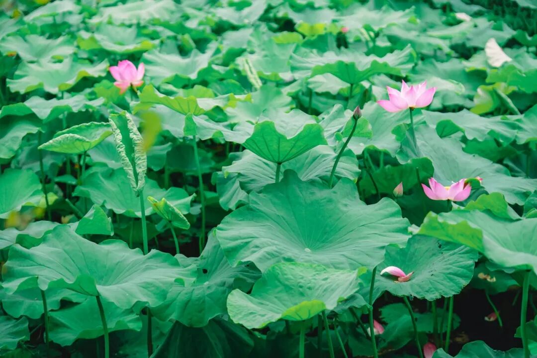 六月初的团山景区,200余亩荷塘早已是“接天莲叶无穷碧,映日荷花别样红”的夏日盛景。一望无际的荷叶翠绿如玉,层层叠叠,高低错落,一朵朵荷花伸展开来,有的含苞待放,有的花开正艳,风姿万千,美不胜收。