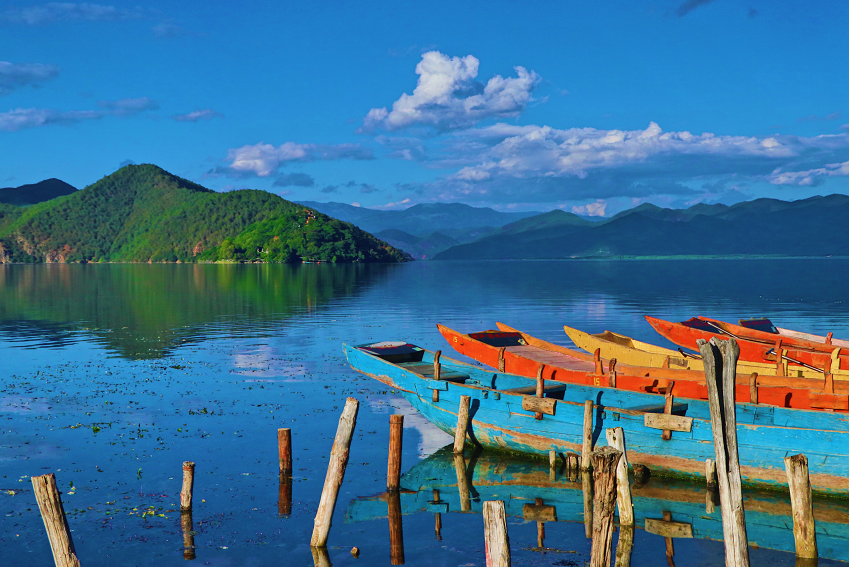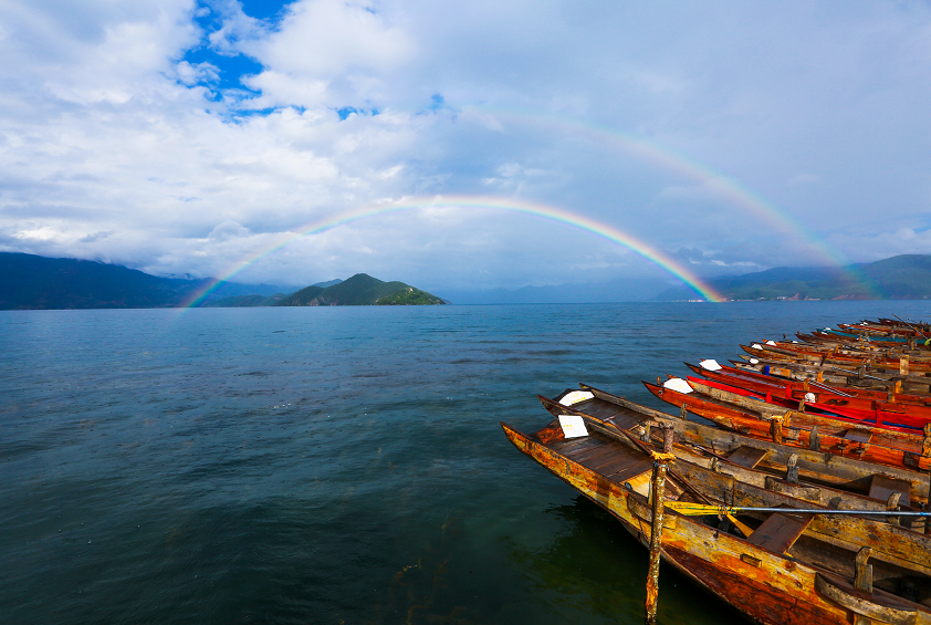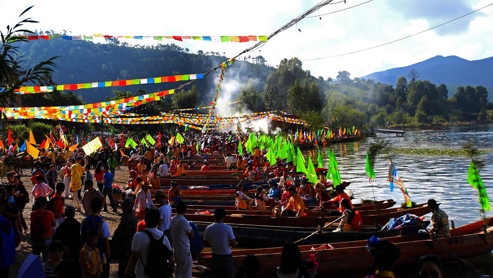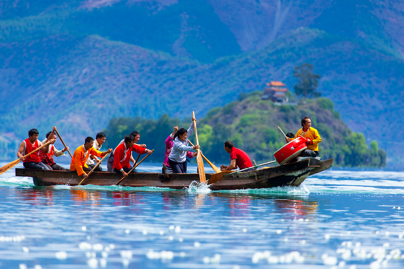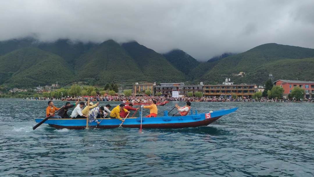 一艘艘船只你追我赶,那摩梭民谣也萦绕在山间,动听悠扬,拨人心弦。