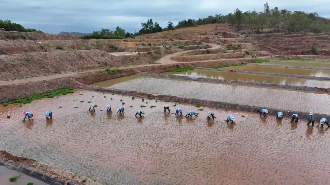 在玉碗水组246亩连片水稻种植现场,连成片的田地灌满了水,宛如一面巨大的镜子,倒映着蓝天白云、房舍树木。田间,绿油油的秧苗横竖成列,生机勃勃。不远处的空田里,来自“幸福里”社区的产业工人们还在忙着整地、起苗、运苗、插秧,田间水花飞扬、水声阵阵,转眼间,一株株青翠的秧苗就被整齐地插进水田中,微风吹拂下一派勃勃生机。
