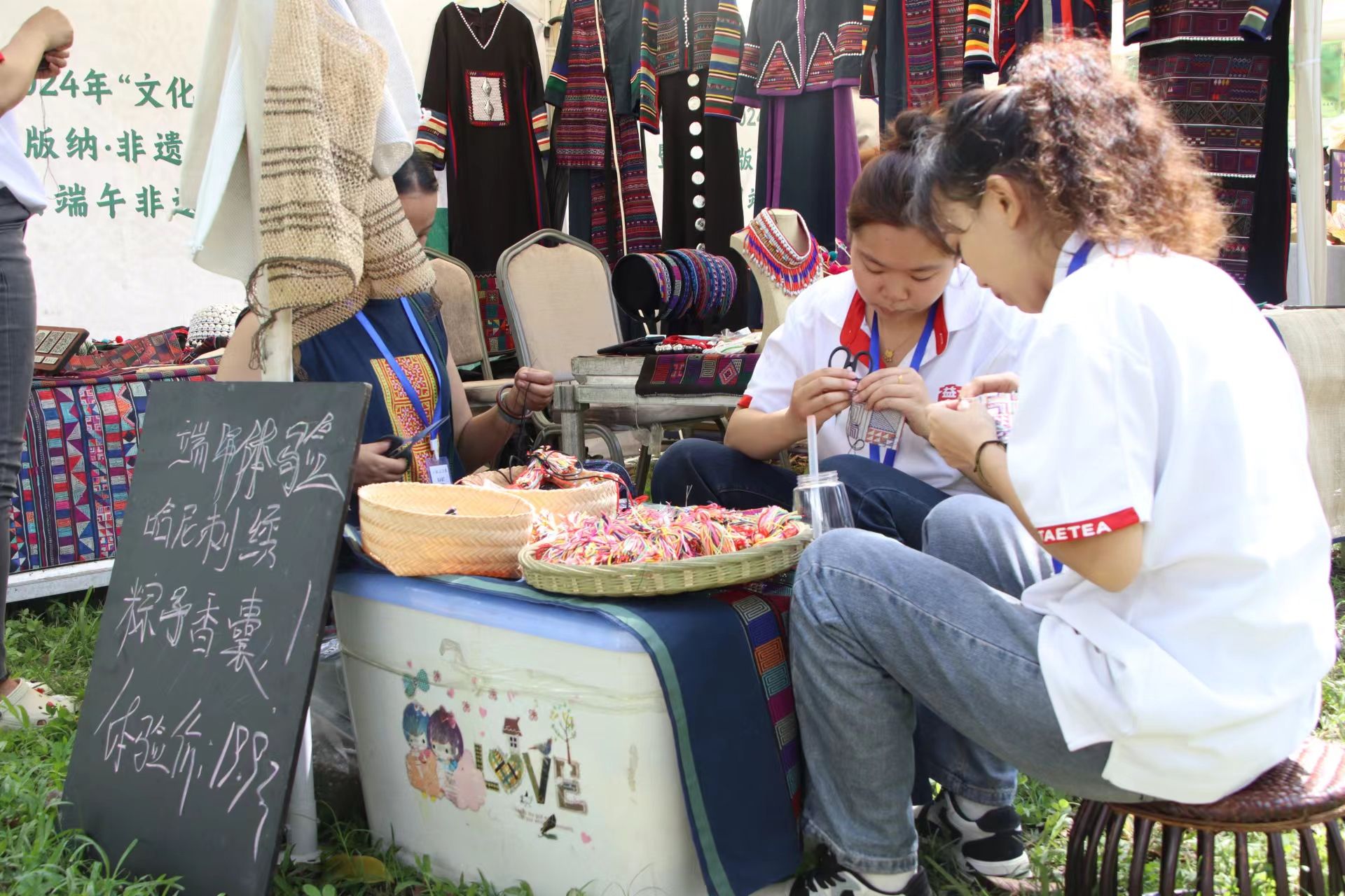 此次非遗赶摆街和非遗造物游园会主要分为文创区、美食区、非遗区、互动区及非遗项目图文展板展示区等多个区域。文创区展示的傣陶、傣锦、傣纸、贝叶经、象脚鼓、哈尼服饰、傣银等传统手工非遗制作及文创产品,尽显民族文化和传统非遗的魅力;美食区有勐海烤鸡、冬瓜煮鸡、竹筒煮鸡、炸牛皮、凉拌、冷饮等小吃,满足食客们的味蕾;互动区开展的射五毒、沐兰汤、编彩绳、画额等传统体验项目备受游客喜爱,竹筒茶制作、哈尼刺绣粽子香囊、傣陶盲盒等非遗体验,让游客在动手制作的同时,感受非遗风采。刚参加了体验活动的高女士表示:“这次活动新意十足,体验感拉满。既有端午传统习俗体验,又能一次性看到、选购到很多非遗好物,才一会工夫,我就已经采购到好多东西。”