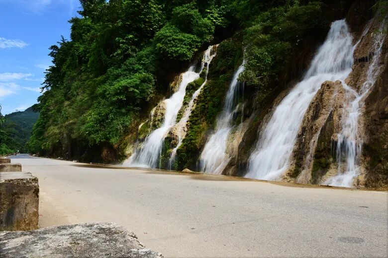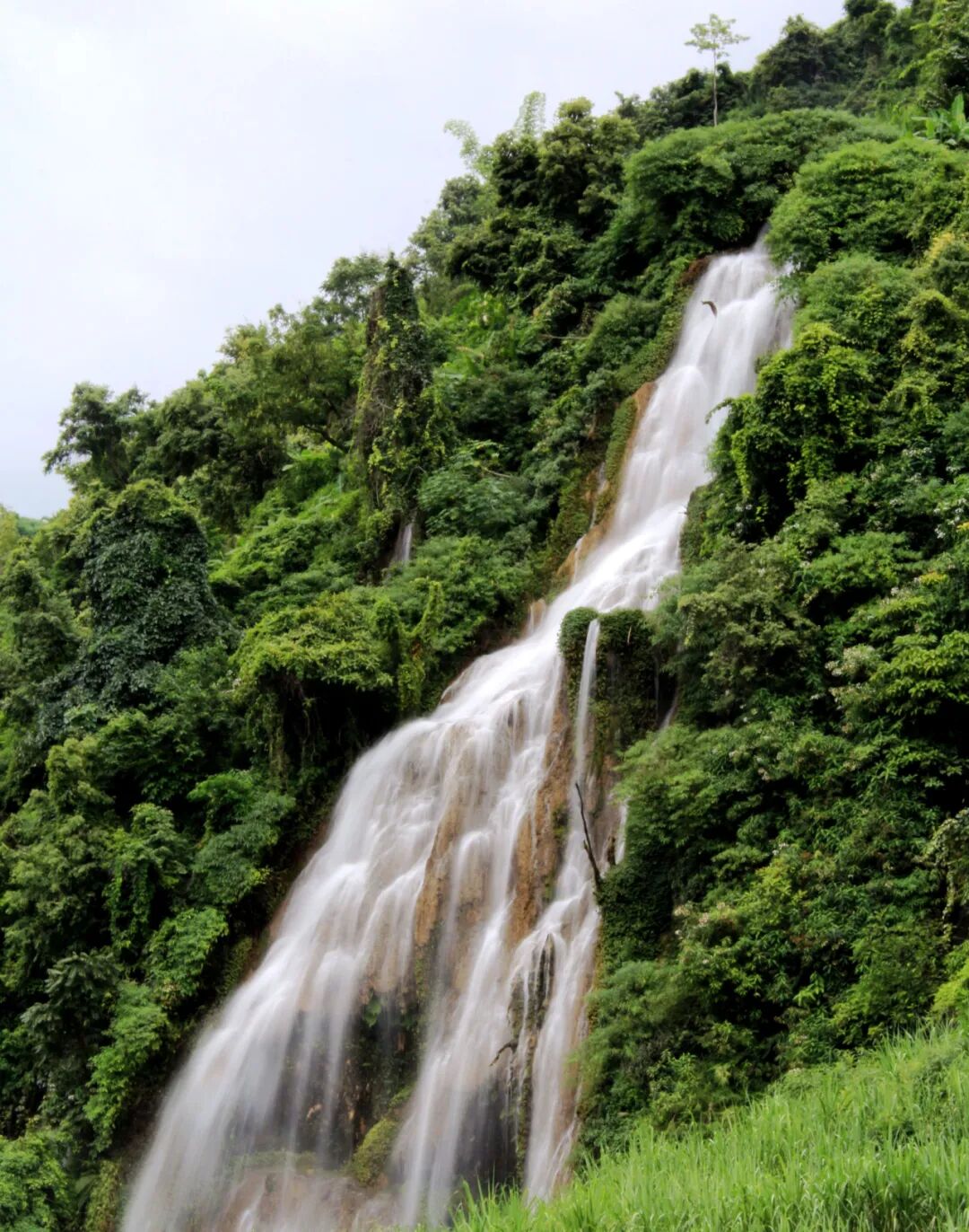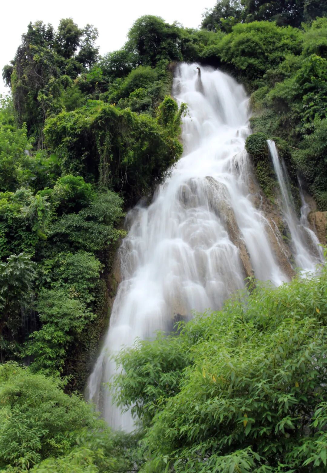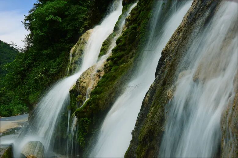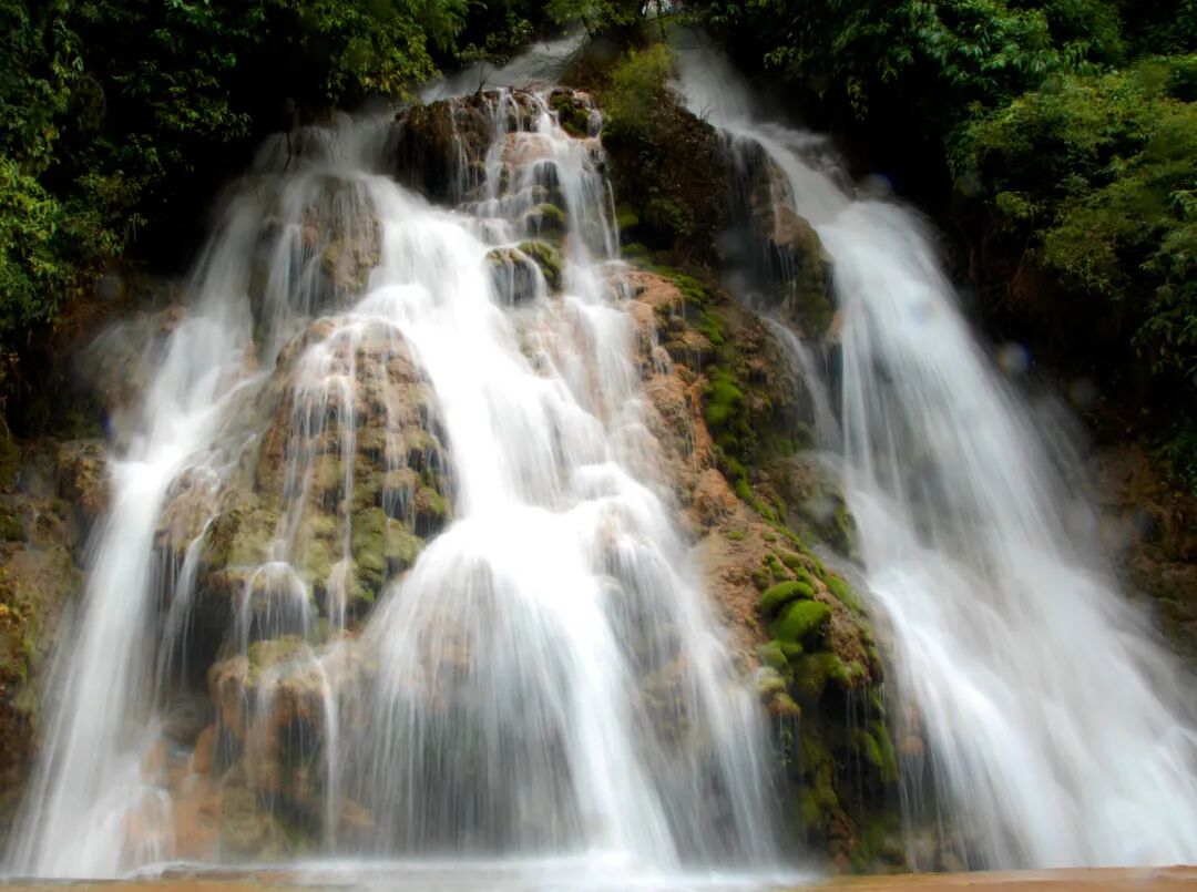 位于勐捧镇白水自然村的白水瀑布,发自于白水山半山腰,水流清澈奔涌,顺山坡一泻而下,形成无数个台阶状跌瀑,远远望去,如一条白色的雾带,顾名“白水瀑布”。远看气势磅礴,如龙戏珠,近看水珠飞溅,寒气逼人。
