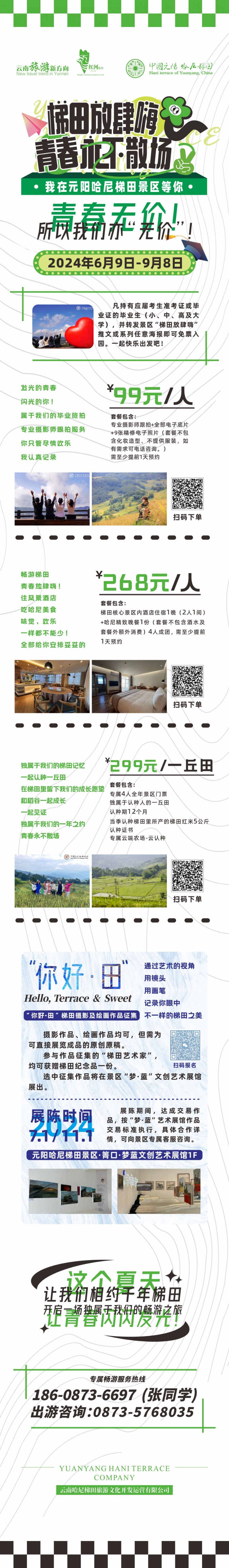 2024年6月9日至9月8日,凡持有应届考生准考证或毕业证的毕业生(小、中、高及大学),转发景区“梯田放肆嗨”推文或系列任意海报即可免票入园。