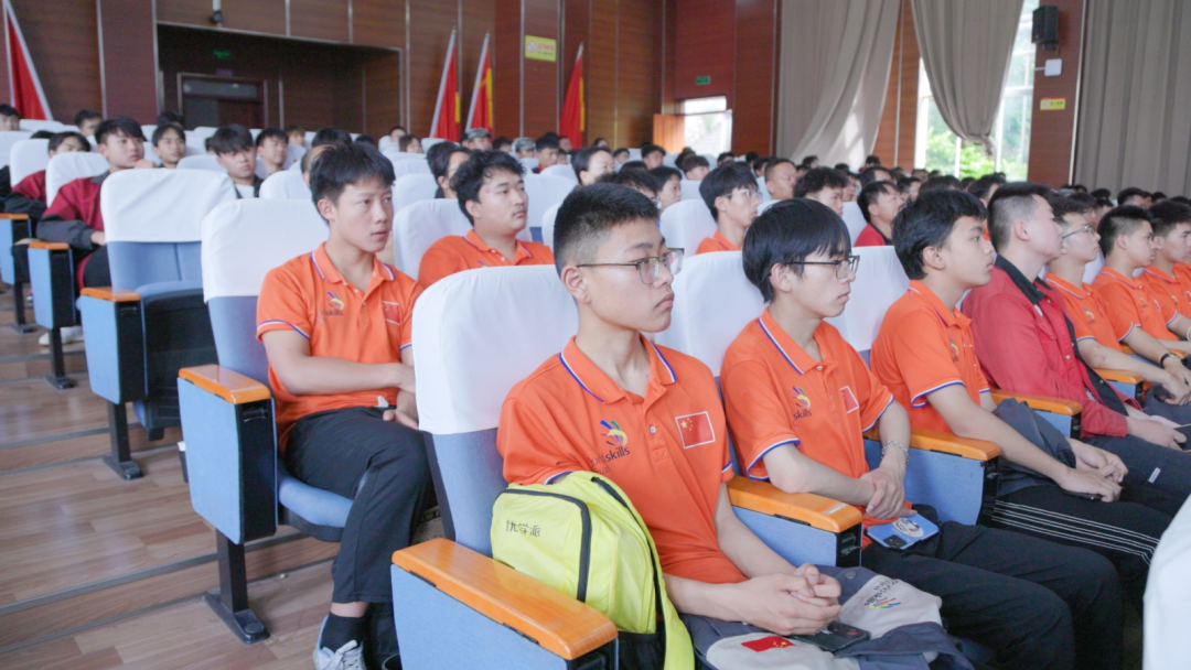 世赛精神宣讲会上,第47 届世界技能大赛制造团队挑战赛项目国家队选手代表卢言琳作交流发言,第 45 届世界技能大赛制造团队挑战赛项目金牌选手、全国技术能手陈鑫鹏教练分享参赛历程。