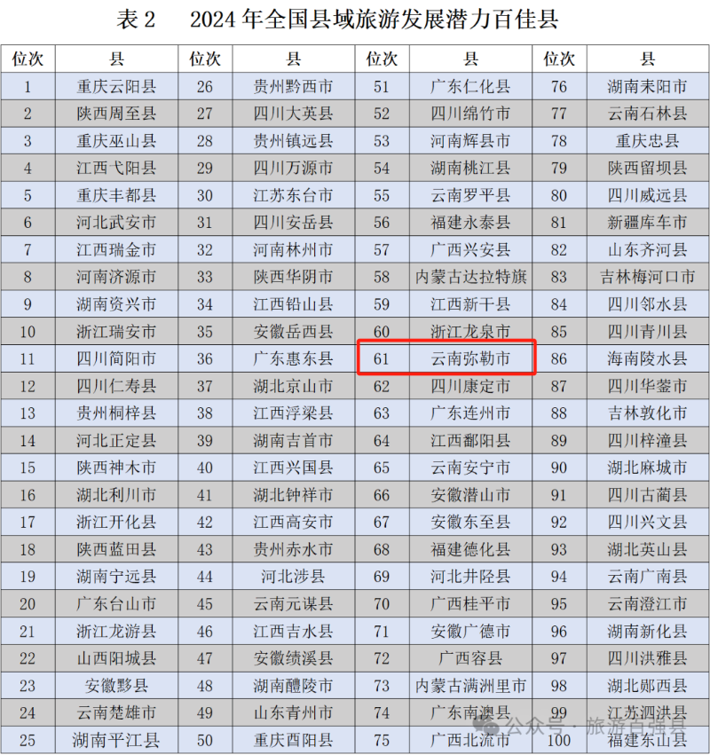 近日,全国县域旅游研究课题组、华夏佰强旅游咨询中心联合发布第六届全国县域旅游研究成果《全国县域旅游发展研究报告2024》暨“2024年全国县域旅游综合实力百强县”“2024年全国县域旅游发展潜力百佳县”名单。其中,红河州弥勒市上榜“2024年全国县域旅游发展潜力百佳县”。