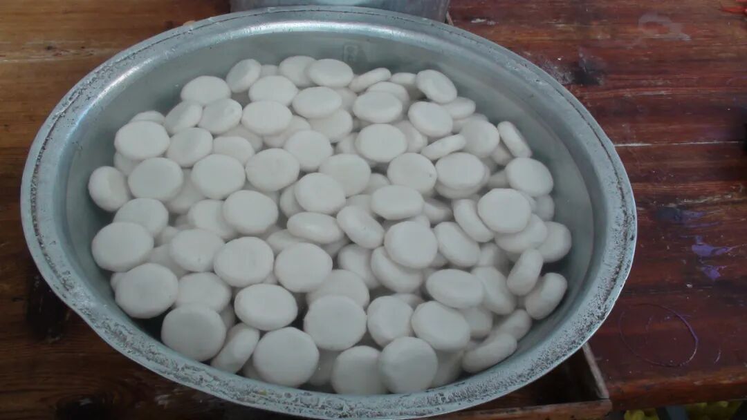 水酥饼制作技艺别具一格——要将生猪板油剁成细丝和面至掰开看到油丝,以作为外皮;饼子成型后、进行烤制前,还要将饼放入水中浸泡三个小时以上,让水、油和面接触,并保持一个适当的温度,于是水酥饼也被人们称为“泡在水里的饼子”。