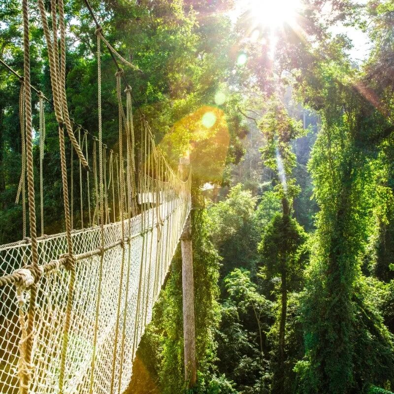 1、望天树空中走廊:以树为桥,以绳为廊,一条在望天树群中搭建的空中走廊,带你与蓝天白云并肩前行,感受天空近在咫尺,雨林尽在脚下的震撼。