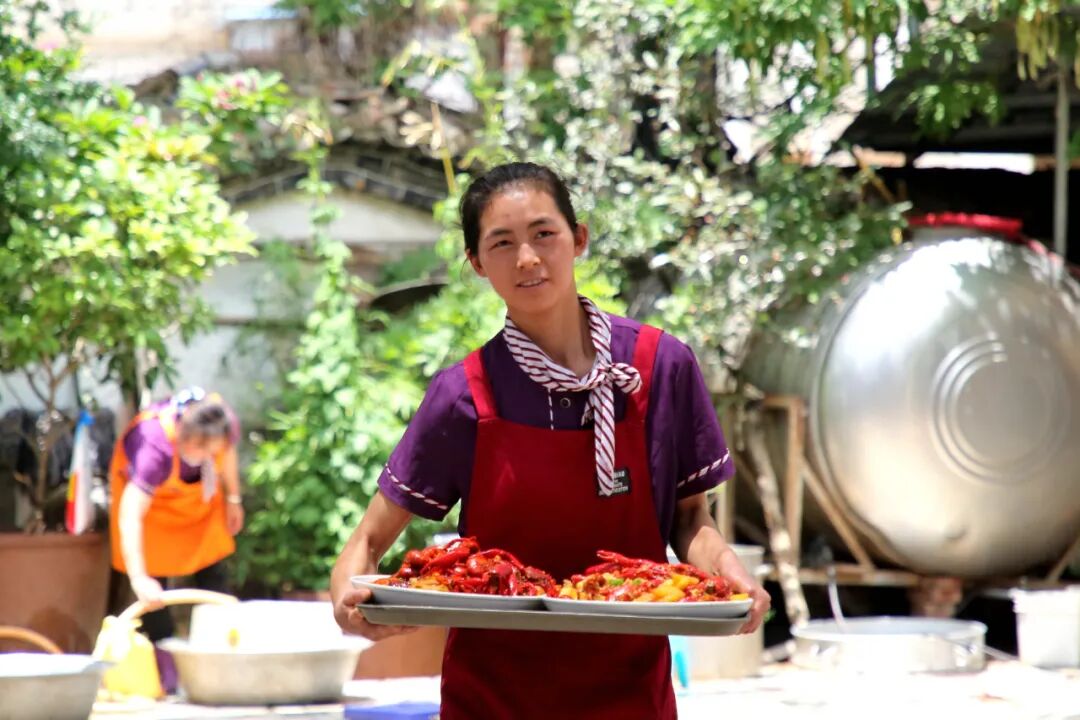 洋芋、青椒、蒜蓉,莲藕、花椒、小米辣,娜姑镇上的餐厅师傅忙前忙后,起锅烧油、下锅翻炒,短短几分钟,一份份色香味美的小龙虾就被端上了客人的餐桌。