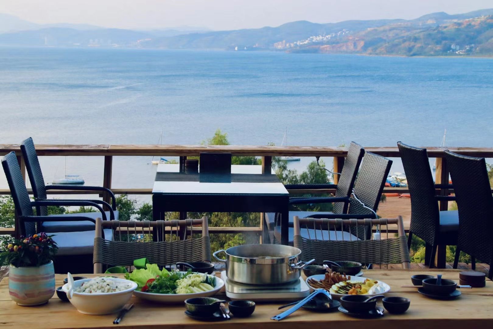 美景当前,怎么少得了美食相伴。别具一格的悬崖餐厅中西美食跨界碰撞,原生态的野生菌美食鲜美可口,摆盘精致的牛排、披萨香气四溢……夕阳西下时,坐在露台一隅,品尝着精心准备的美食,就着满眼的湖光山色,享受属于自己美妙轻松的时刻。