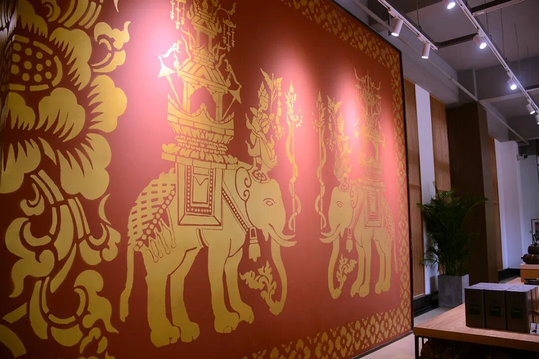 孟连傣族金水漏印气韵生动,金色的图案在暗红色的墙面上显得金碧辉煌,如今被广泛运用于佛寺建筑、演艺大厅、民居建筑、广告宣传、城市美化等场景中。2022年12月,孟连县申报的傣族金水漏印被列入云南省第五批省级非物质文化遗产代表性项目名录。