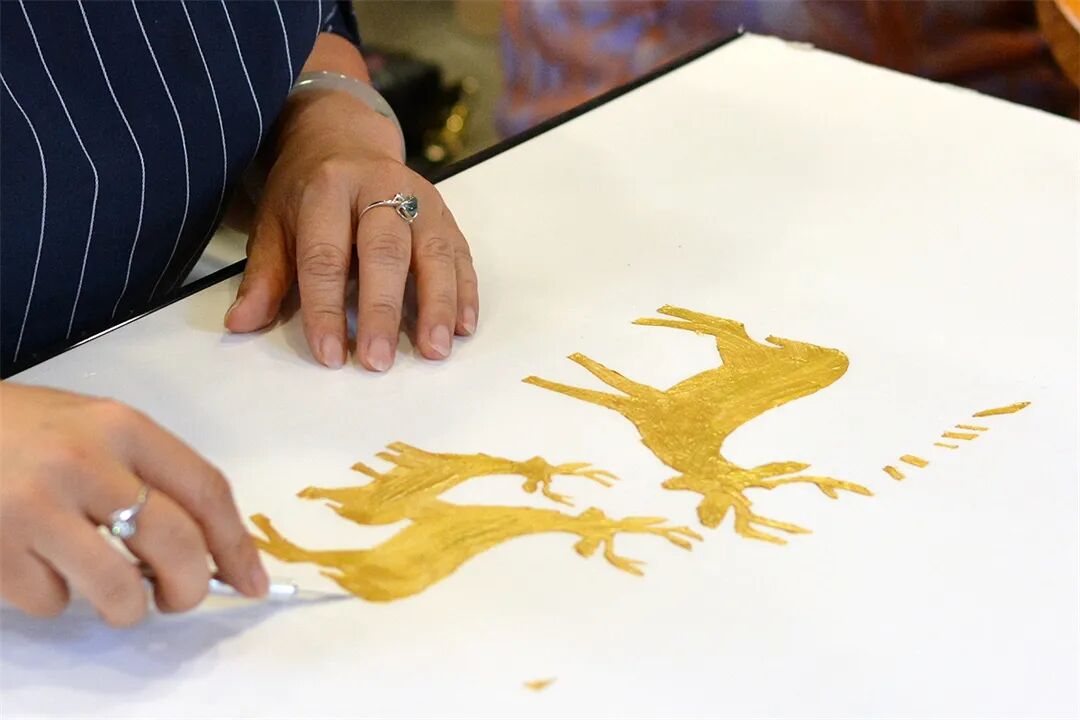 傣族金水漏印采用我国传统刻制方法之一的阴刻手法完成建筑纹、动物纹、植物纹、人物纹、几何纹等图案刻板,把图案覆盖在刷好的黑、红土底色漆上,再用金粉拓印制作而成金色图案,展现出浓厚的傣族民族艺术文化意蕴。
