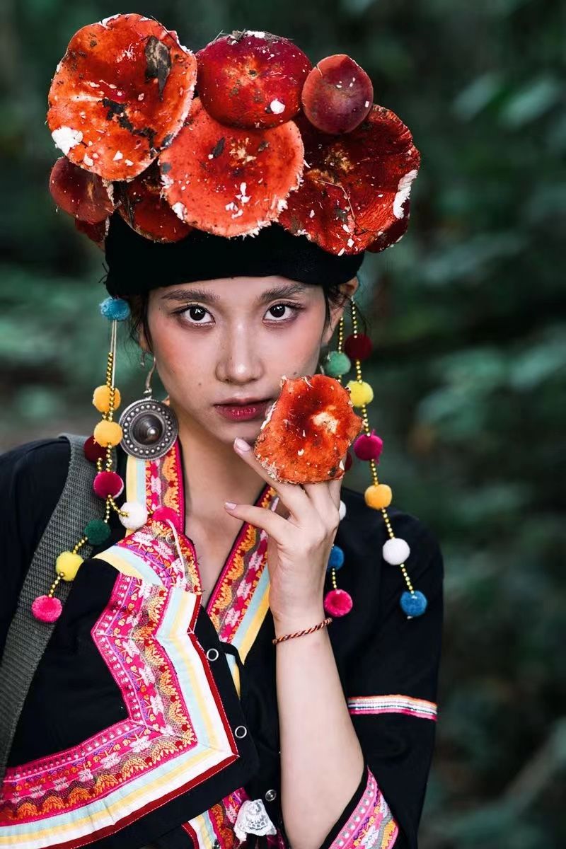 留下一组惊艳时光的大红菌簪花写真