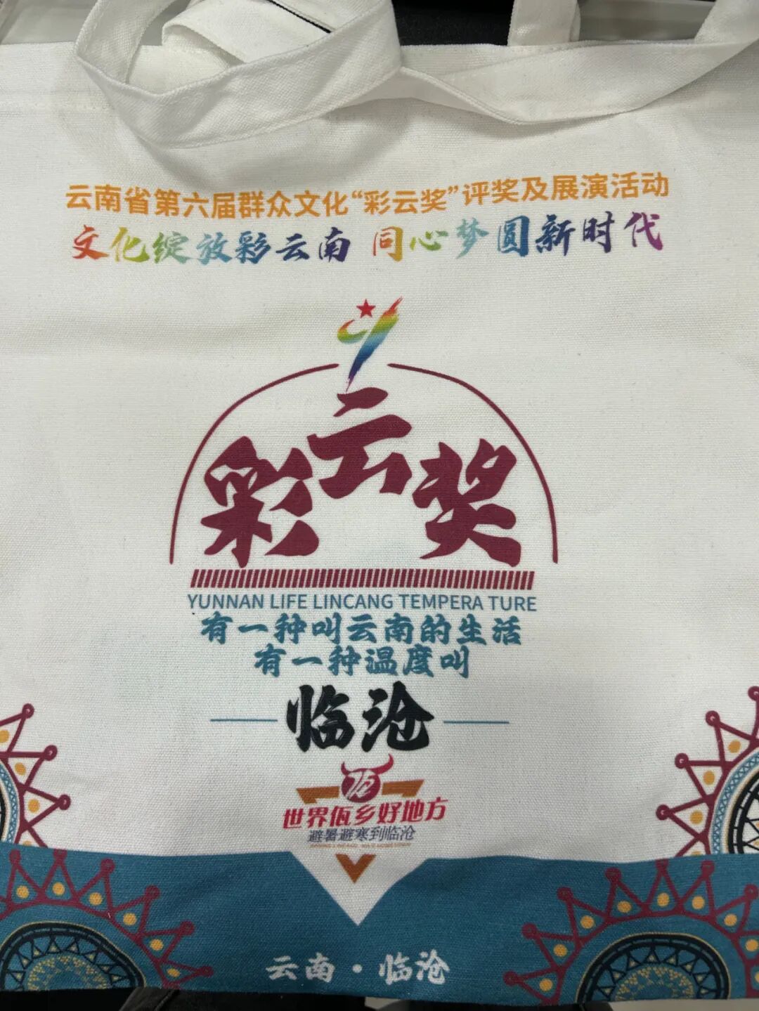 手提袋上印有此次“彩云奖”宣传口号以及临沧特色文化元素,不仅展示“彩云奖”文化内涵,也展示了临沧的独特魅力,同时兼顾实用性。