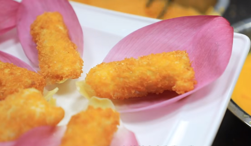 白酒荷花卷是当地厨师的一道拿手好菜。选用刚刚采摘来的鲜艳荷花,切碎搅拌均匀,加入当地自酿的甜白酒,让荷花的清香充分沁入甜白酒之中,然后冷冻备用。烹饪的时候,将甜白酒取出切成条状,裹上糯米纸,沾上蛋液和面包渣,下锅小火慢炸至金黄,出锅摆盘。一片片粉红色的花瓣衬托出金黄色的白酒荷花卷,不仅有视觉上的清新脱俗,咬一口更让人觉得清脆酥糥、唇齿留香、回味无穷。