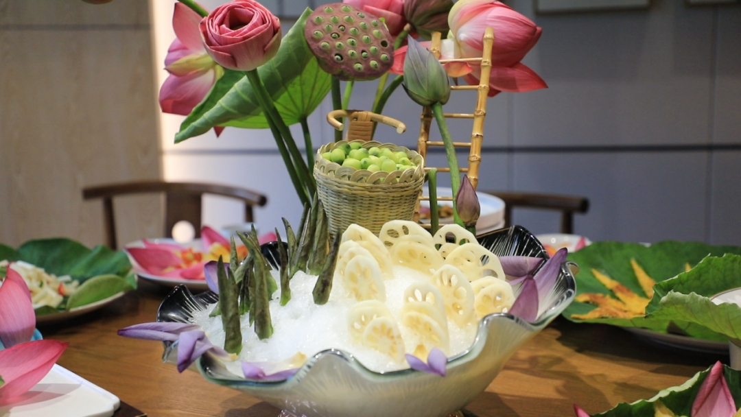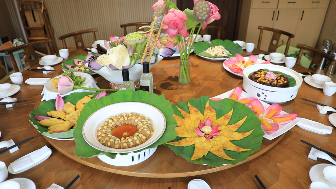 在接天莲叶无穷碧间,一场场属于荷花的饕餮盛宴也正在光镇古镇上演,荷塘边上大大小小的餐厅里,以荷花、荷叶、莲子为主要原料制作而成的各种美食琳琅满目。