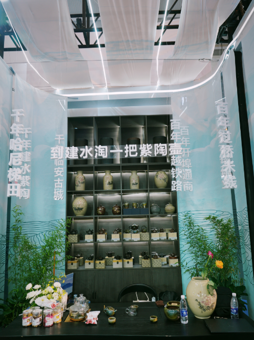 本次南博会,红河文旅在11号馆“文化旅游体育馆”设置了150平方米的旅游形象展区。展台内,“蓝天白云”下,哈尼梯田绿意盎然,仿佛让人置身云端。碧色寨、米轨火车、太平湖森林小镇、双龙桥等红河文旅形象IP跃然眼前,还有以“去建水淘一把紫陶壶”为主题打造的紫陶体验区,兼具新锐和古朴,自然与艺术,让人置身其中,就像是去到了红河——这个最云南的地方。