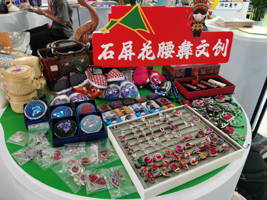 展台分为风物、文创、非遗三个区域,每个区域都展现了红河独特的人文魅力。在中间不规则组合区域为文创区,侧边为非遗区,最里面是风物区。各个展位各有特色,根据不同的类型组合在一起,寓意着不同产品“拥抱”出红河的创新。