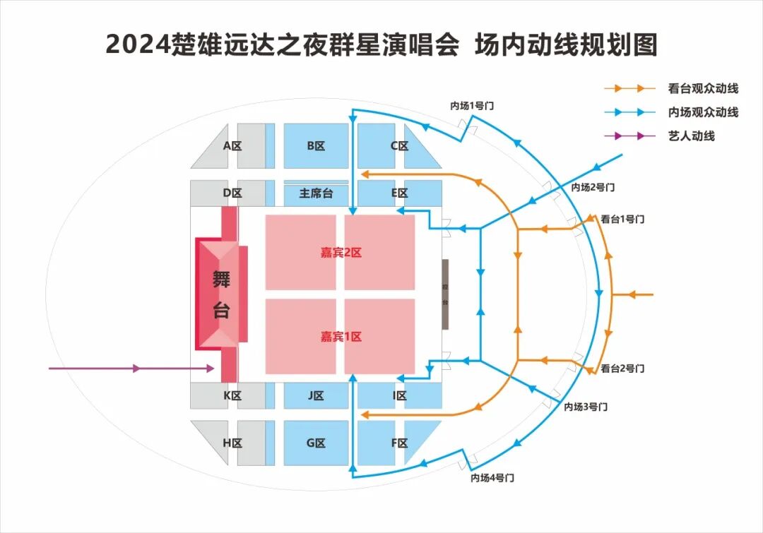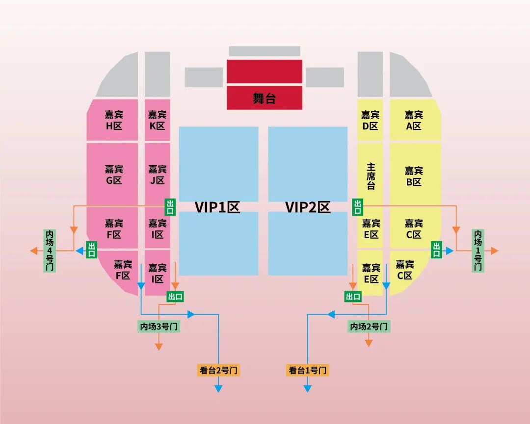 观众持门票进入初检区---观众持门票进入检票区---安检通道---进入演唱会现场分区落座---欣赏演出---演出结束---观众从体育馆“安全出口”有序退场,出口示意图如下: