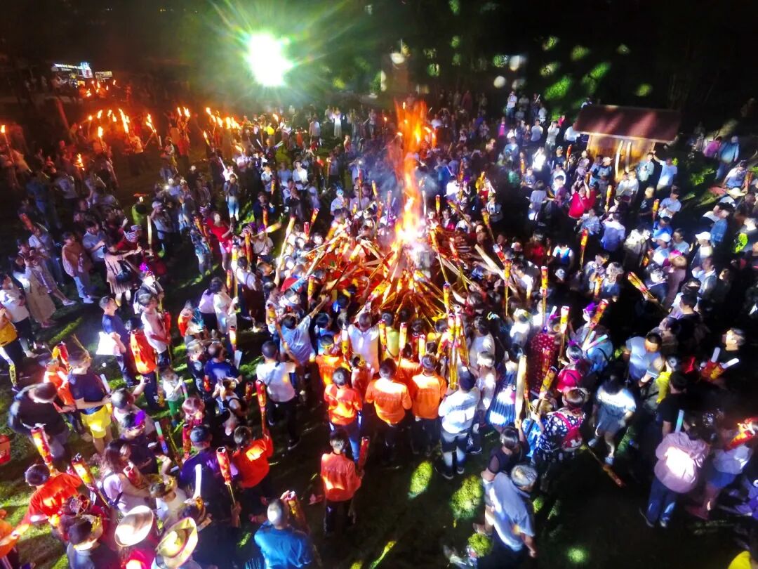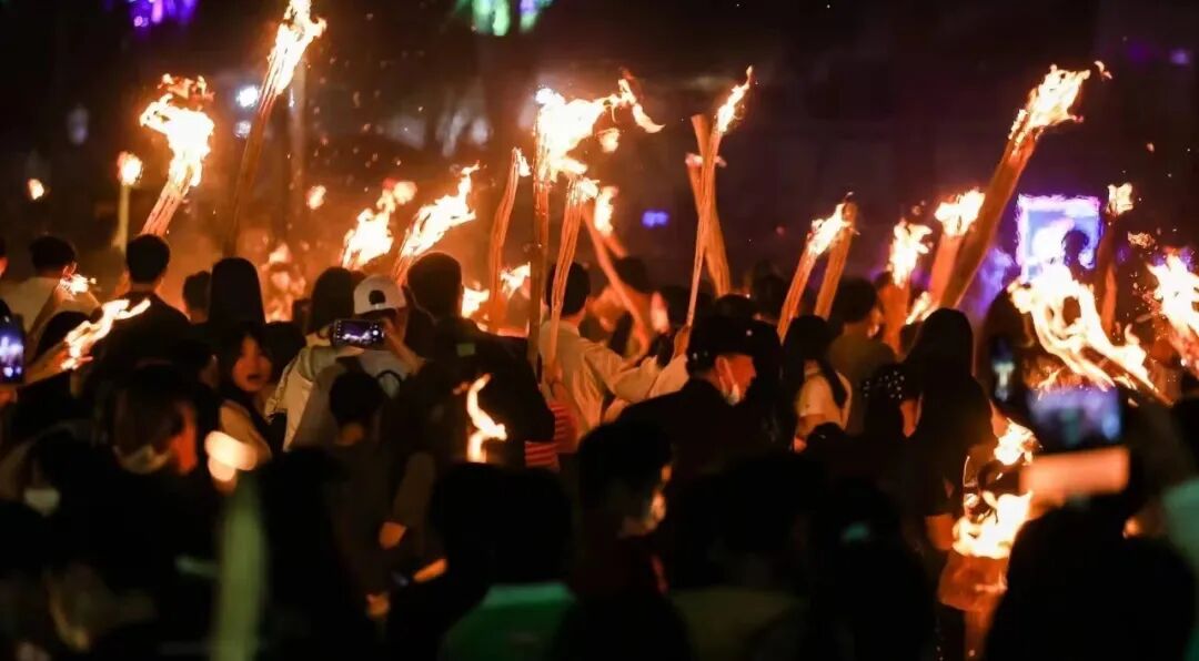 昆明轿子山景区“2024彝迪·狂欢火把节”将火把节“火把巡游”环节升级为一次大型的彝族蹦迪活动。