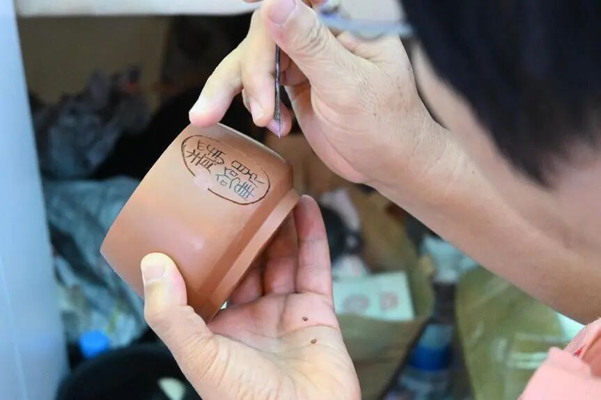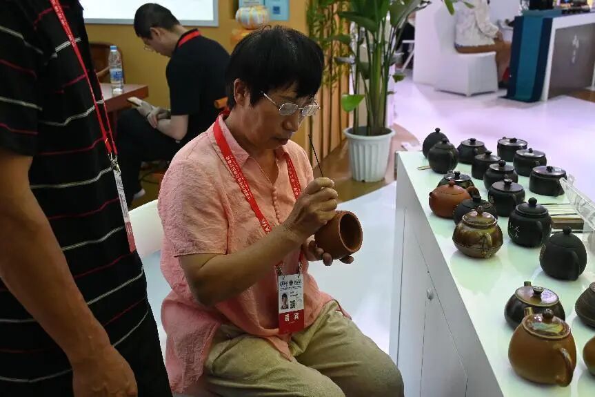 人流熙攘的展馆里,杨庆芬拿着刻刀专注地琢磨着手里的陶坯。她是国家级非遗项目建水紫陶烧制技艺的县级代表性传承人、建水老字号陶坊“杨元记”的第六代传承人。她和丈夫合开的、由徐悲鸿夫人廖静文题字的“木忠陶坊”早在多年前就已成为国家级非物质文化遗产“建水紫陶烧制技艺”传承点。