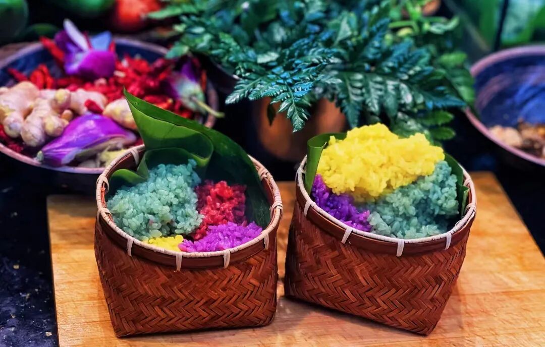 还有彩色糯米饭搭配舂干巴或烤三线肉、菠萝饭