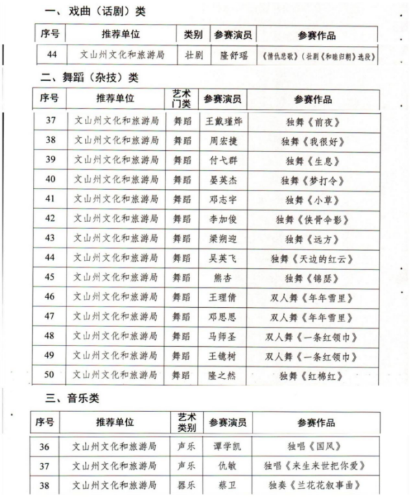 为进一步促进文山州文艺事业的繁荣发展,不断发现、培养、挖掘优秀青年舞台表演、创作人才,展示近年来文山州文艺人才的培养成果,文山州文化和旅游局高度重视本次比赛,广泛动员,严密组织,经过层层筛选,确保推荐质量。