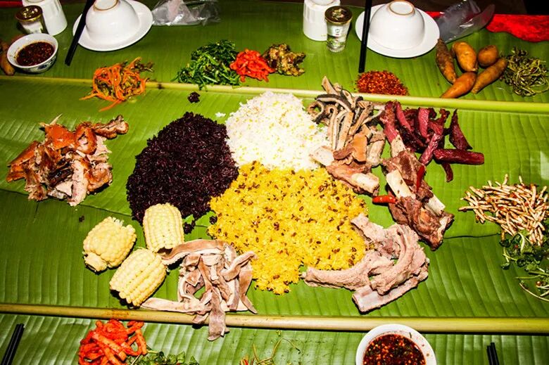 烤乳猪、佤王宴、鸡肉烂饭、火烧牛干巴、沧源豆豉米干、佤族酸笋煮鸡、牛撒撇、竹虫、蜂蛹、佤族水酒。