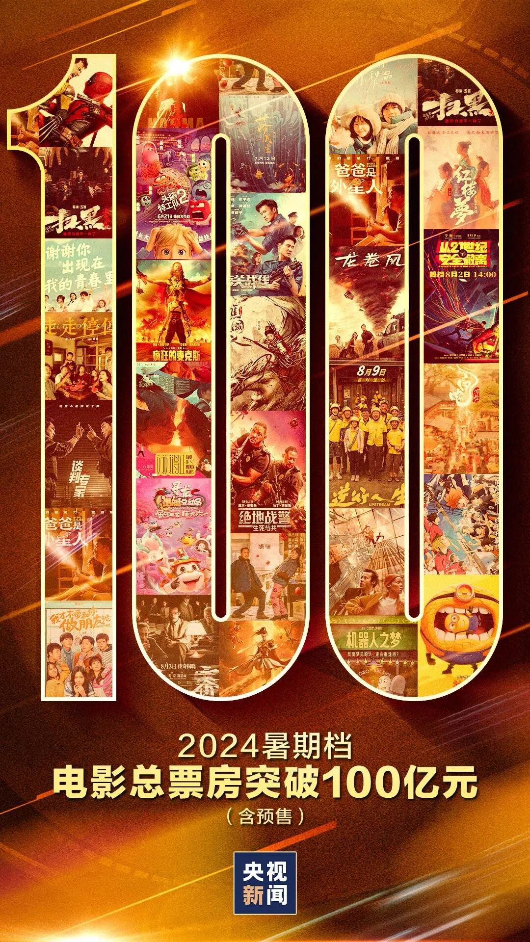 据网络平台实时数据,截至8月17日23时25分,2024年暑期档(6月—8月)档期总票房(含预售)突破100亿元。