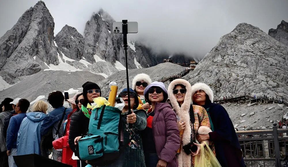 6月20日,越南游客在丽江玉龙雪山拍照。新华社记者王贤思 摄