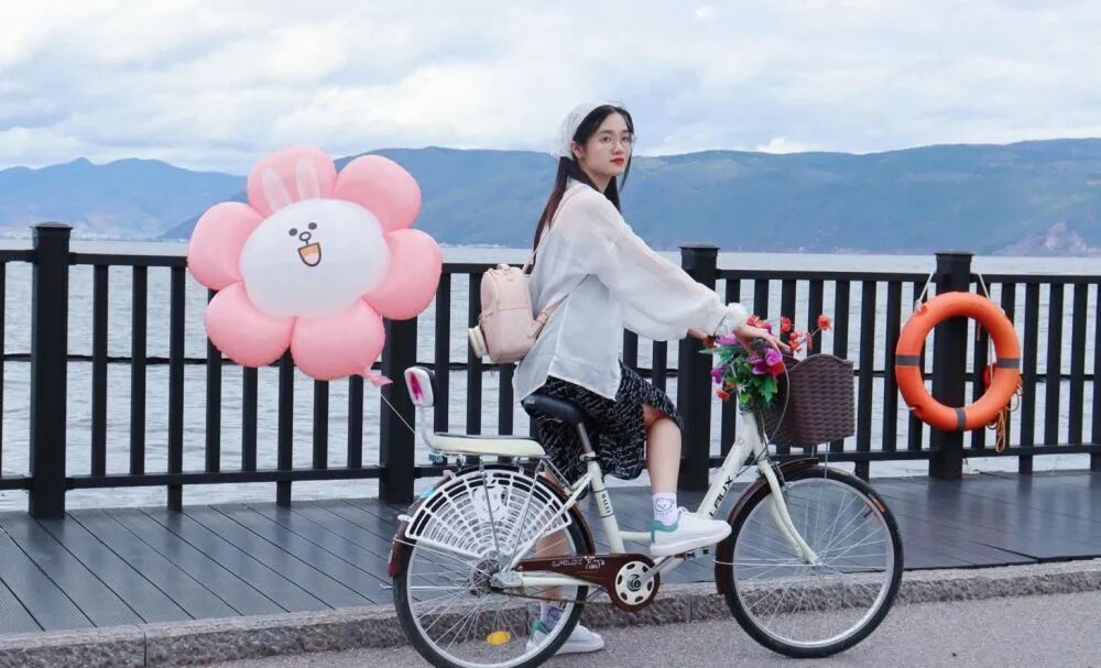 7月5日,越南游客在大理洱海边骑行。新华社记者王贤思 摄