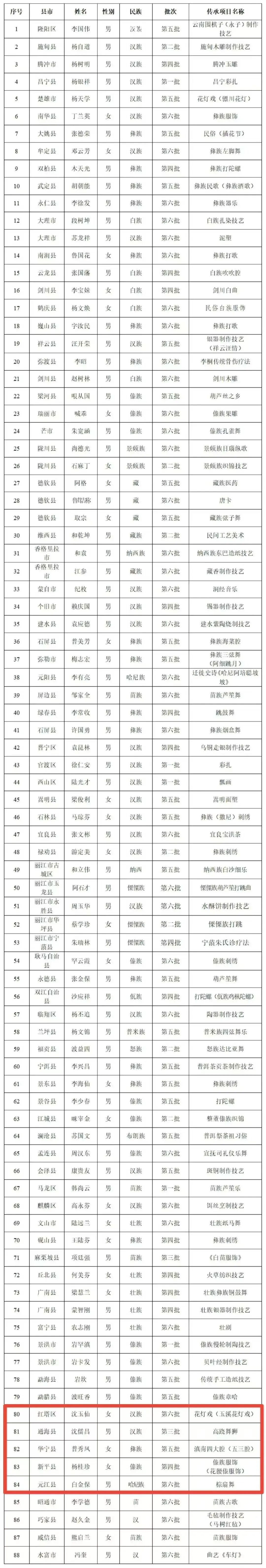 根据《云南省非物质文化遗产保护专项资金管理办法》,按照《云南省文化和旅游厅办公室关于开展2023年度省级非物质文化遗产代表性传承人传承活动评估工作的通知》要求,经实地评估、调查核实、专家评审等程序,从全省在世省级传承人中遴选产生88名拟评为2023年度优秀传承人。现将名单予以公示。