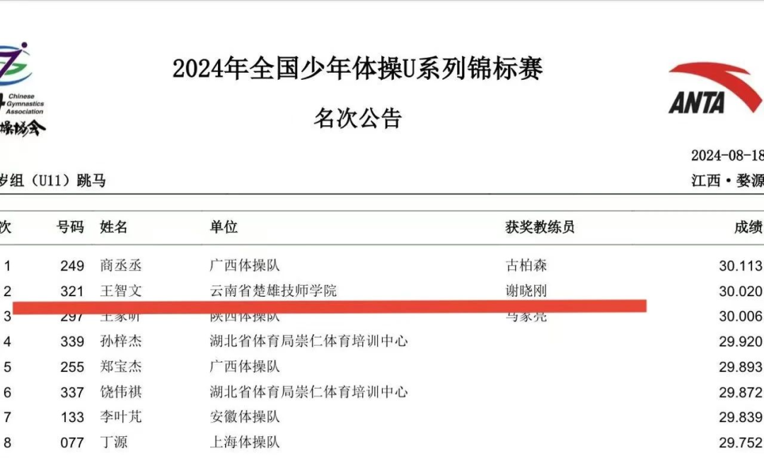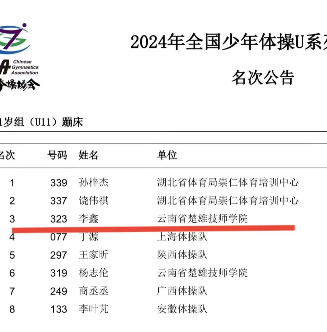 【喜报】楚雄技师学院组队参赛的体操队在全国少年体操U系列锦标赛中斩获1银1铜 2024-08-20 09:44 0 由国家体育总局在江西婺源举办的“全国少年体操U系列锦标赛”中,由楚雄技师学院组队参赛的体操队斩获跳马银牌、蹦床铜牌,获得6项前8名的好成绩! 来源 云南现代职业技术学院 责编 康莞悦 审核 李元