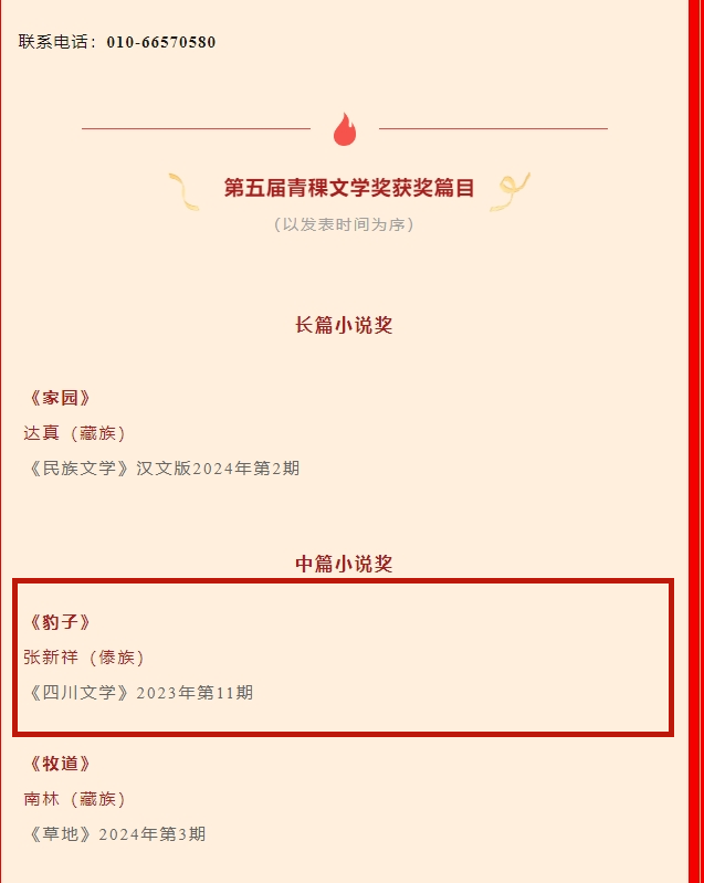 第五届青稞文学奖终评会于8月15日在北京举行。经终评会讨论和投票表决,产生获奖作品6部(篇),其中长篇小说1部,中篇小说5部,影视剧本奖空缺。临沧傣族作家张新祥中篇小说《豹子》获奖。