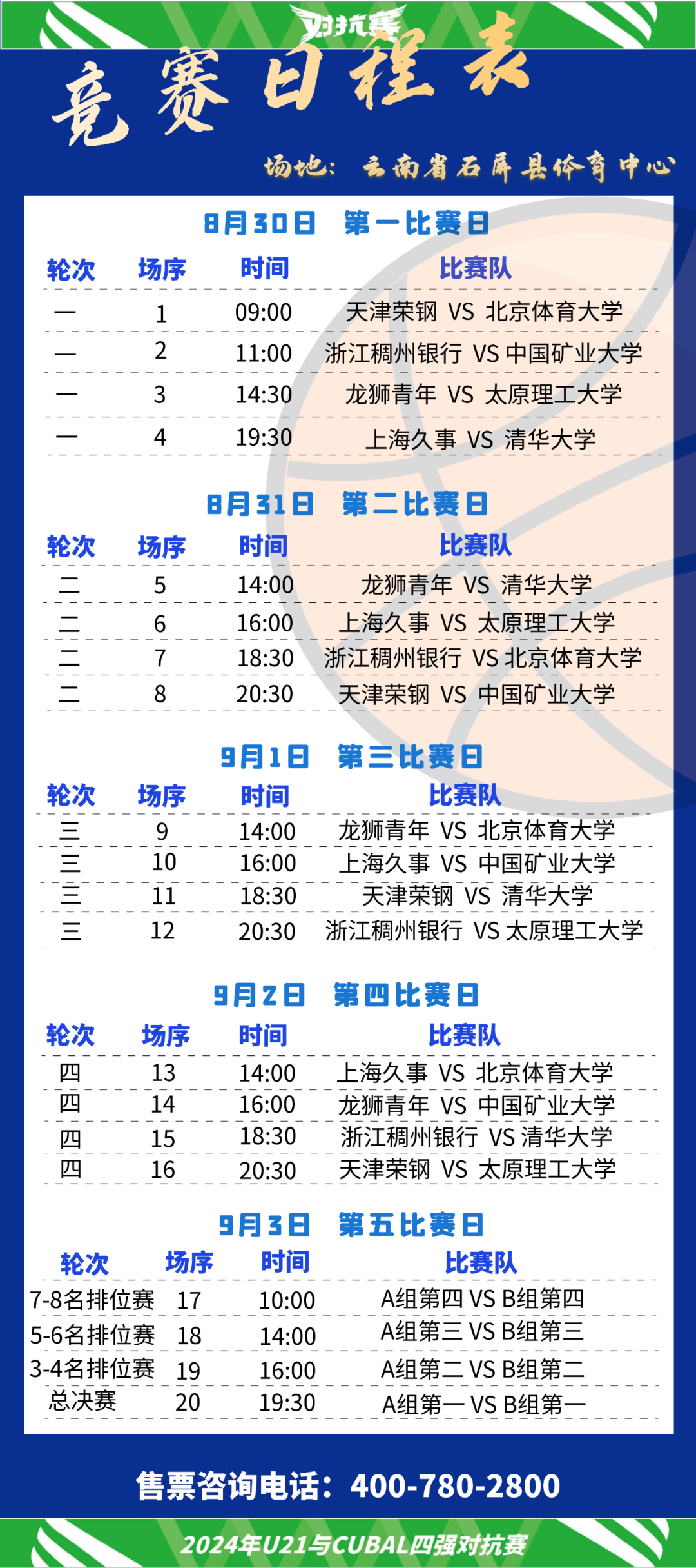 届时,8支青年篮球队将在石屏精彩对决。分别是U21:浙江稠州银行、天津荣钢、上海久事、龙狮青年;CUBAL:清华大学、太原理工大学、北京体育大学、中国矿业大学。