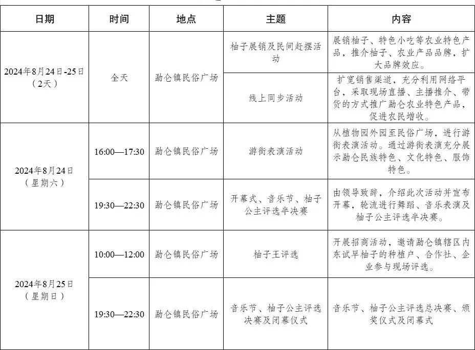 “柚”见秋日之约,“柚”见勐仑,勐腊县勐仑镇的柚子迎来大丰收。这个周末,勐腊县首届热带雨林文化节之“柚见幸福 · 柚见勐仑”2024年勐仑第八届柚子节暨“久瀛谷杯” 柚子公主评选大赛将在勐仑镇民俗广场盛大开幕。其中,柚子展销及民间赶摆活动将在周末两天全天开设,活动期间将开展的游街表演活动,柚子节开幕式、音乐节、柚子公主评选、柚子王评选等活动,让你周末“嗨”不停。
