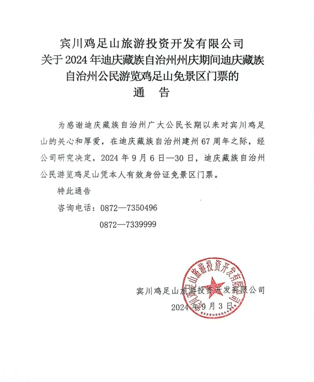 为感谢迪庆藏族自治州广大公民长期以来对宾川鸡足山的关心和厚爱,在迪庆藏族自治州建州67周年之际,经公司研究决定,2024年9月6日—30日,迪庆藏族自治州公民游览鸡足山凭本人有效身份证免景区门票。