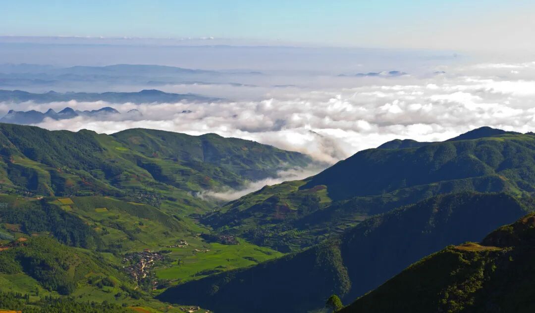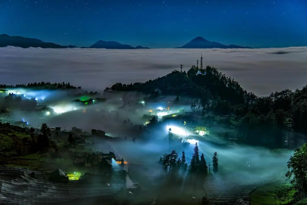 麻栗镇茨竹坝身处高山之上云海之下,常年被云雾笼罩。登高俯瞰,云海“汹涌”,瑰丽多姿,片片白雾缠绕在山间田野,白云在脚下翻滚、打闹。日落时分,当茫茫云海遇上夕阳,犹如蓬莱仙境。夜幕降临,点点星月与云海缠绕,感受大自然的无穷魅力。