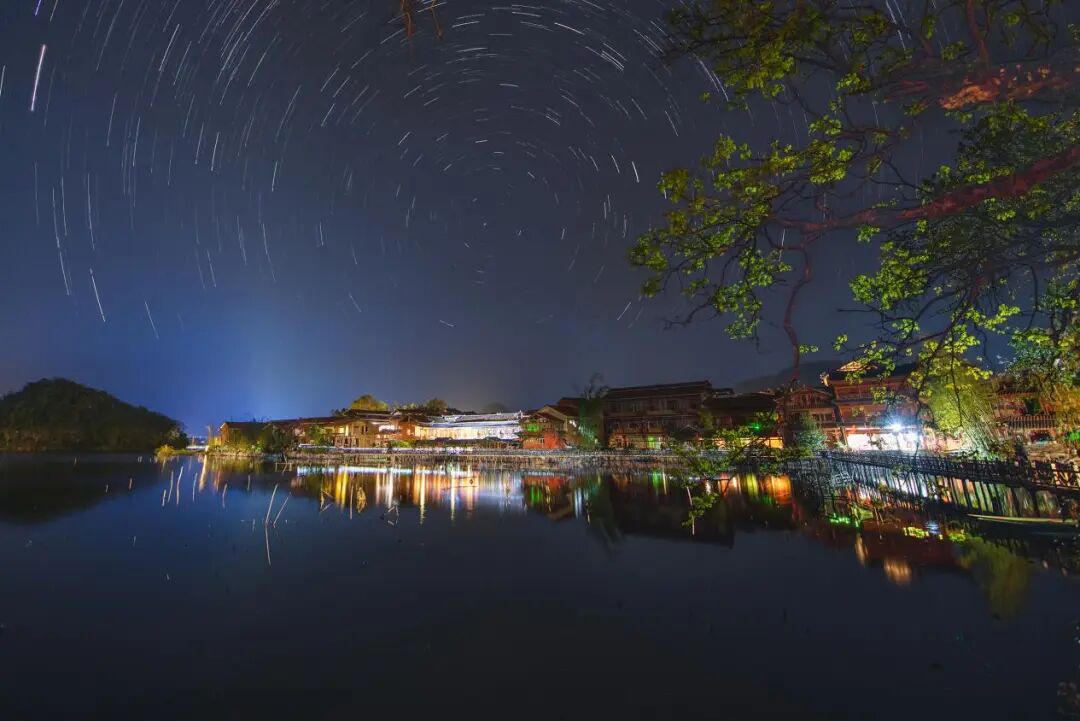 近水镇以河成街,桥街相连,依河建屋,黑瓦白墙,河道廊坊,临河水阁,水镇一体,呈现出一派恬静、优雅的清静,是高原水乡的典型的“小桥、流水、人家”。月色之下,清风徐来,近水镇多了几分静谧,微微泛黄的灯光伴着白色月光,让黑夜多了几许温暖。慢慢踱步其中,阡陌巷口,院落围墙,门户井窗,砖瓦土石,每一个角落都显露出不一样的田园生活气息。