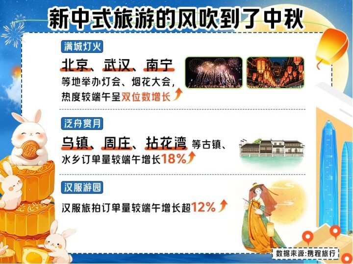 这个中秋,赏灯会、观赏烟火、泛舟赏月、汉服游园等富含传统文化元素的活动成了游客的热门选择。这些活动不仅让游客沉浸感受中国传统文化的魅力,也带动了相关目的地的热度显著上升。