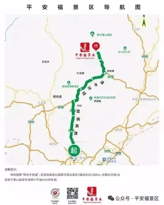 平安福景区距离昆明市区108公里,走昆倘高速至倘甸收费站下高速,全程仅需90分钟。